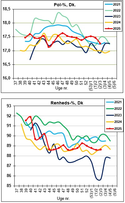 I nedenstående kurver vises pol-% og renheds-% for de sidste fem år.